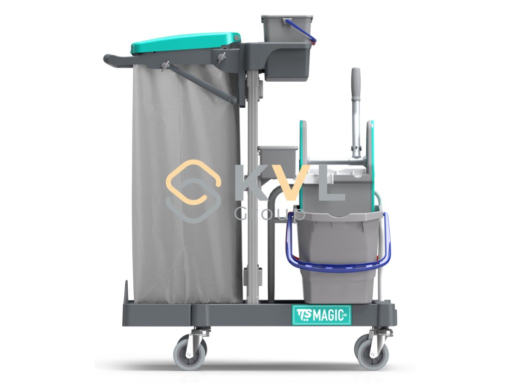 Úklidový vozík Magic Line 70B je víceúčelový, minimalistický a profesionální pomocník, který je ideální pro úklid menších ploch. Jeho hlavní výhodou je profesionální ždímač mopu a úložný prostor, který umožňuje průběžné ždímání mopu a ukládání potřebných nástrojů. Vozík je vyroben z recyklovaného polypropylenu, což z něj dělá ekologickou volbu.